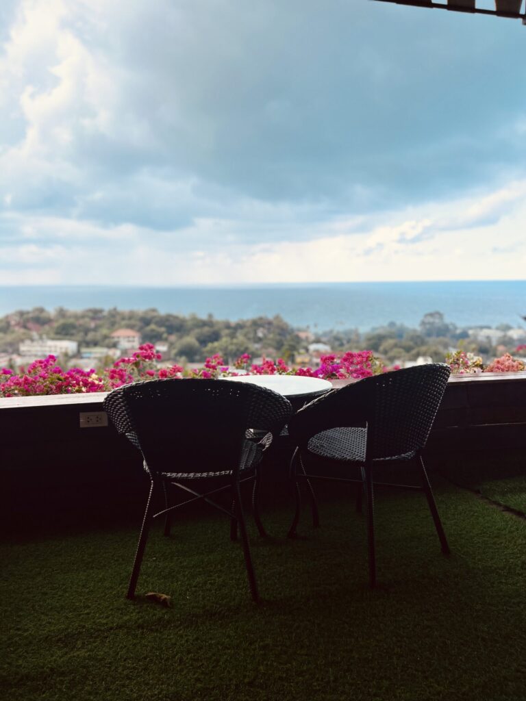 I exit the cable car and walk amongst a stone walkway that leads me even higher. By now I feel like I have indeed reached the clouds. I follow the path to a huge tree house-like structure nestled within the lushness. Climbing more steps to the top, I engage with the most breathtaking view. I enter a charming quaint cafe, small and airy. I’m seated at a table in front of the magnificent view. I cannot believe I made it up so high. I look around trying to take in everything that my eyes see.